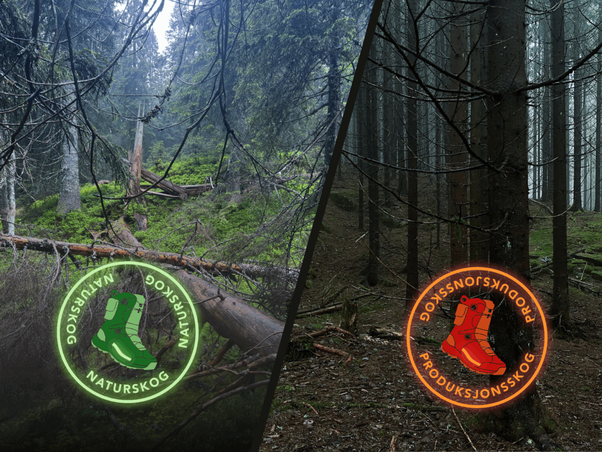 Stadig mer av skogene våre er flatehogd, plantet, og skal hogges igjen. Her blinker skoen rødt. Aldri før har vi hatt mindre naturskog – skog som er lite påvirket av mennesker. Her blinker skoen grønt.